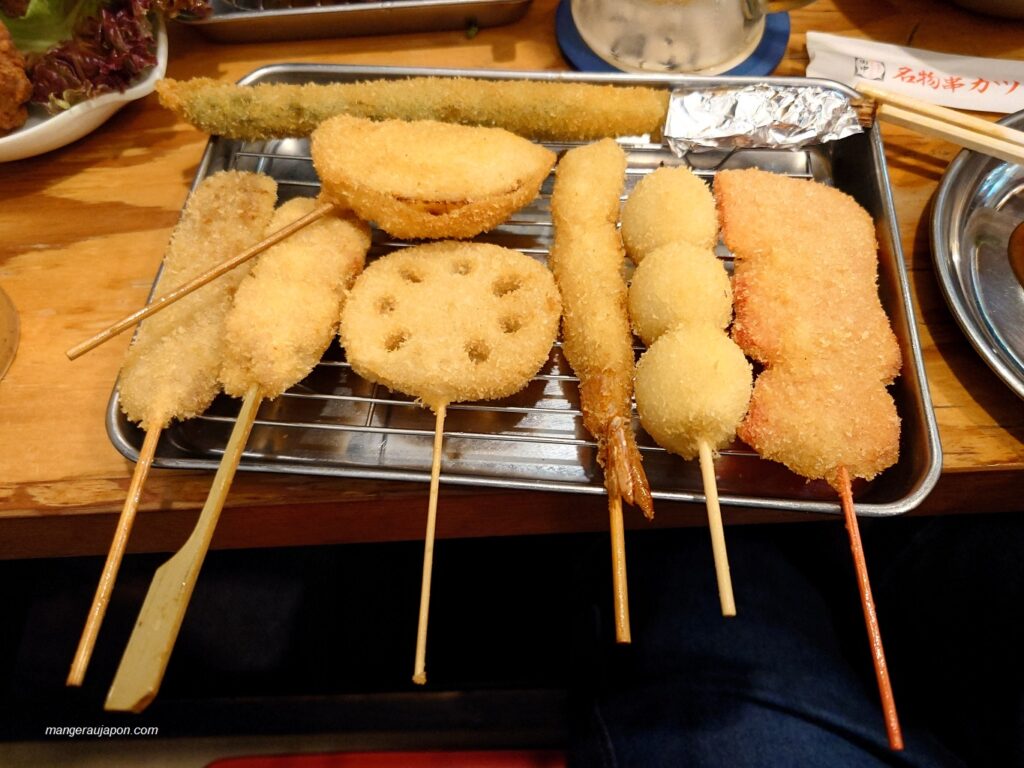 Le menu de kushikatsu (brochettes frites) propose des formules (sets) mais aussi des commandes à la carte, ce qui permet de composer son repas librement.