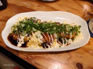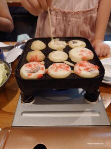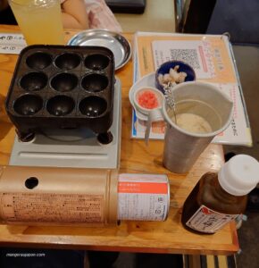 Un autre point original, c’est la possibilité de faire soi-même les takoyaki, ces boulettes à la pieuvre qui sont une autre spécialité d’Osaka.