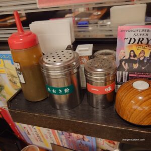 Concernant l’okonomiyaki, les sauces et condiments sont disponibles sur la table :