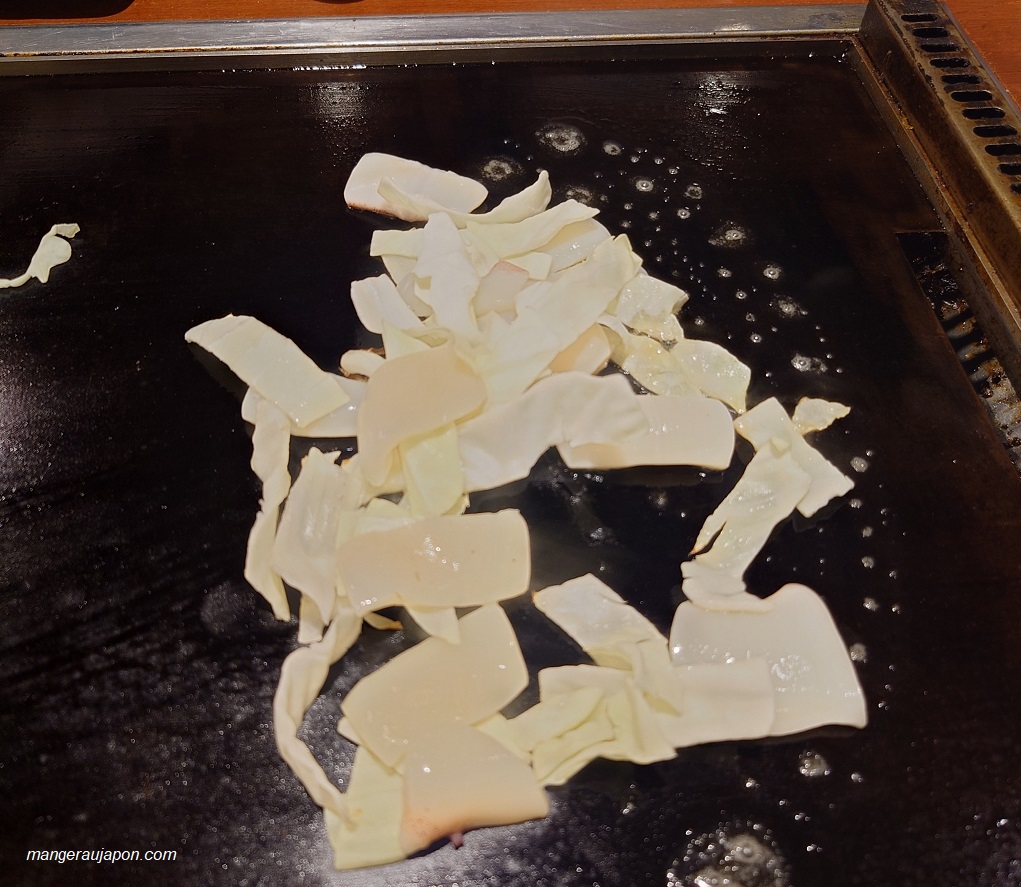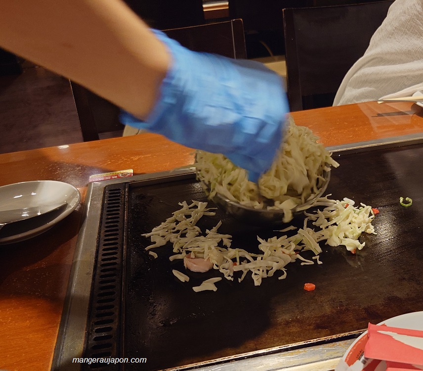 Cela dépend des restaurants, mais dans celui-ci, ce sont les serveurs qui préparent l’okonomiyaki pour vous, directement sur la plaque chauffante de la table.
