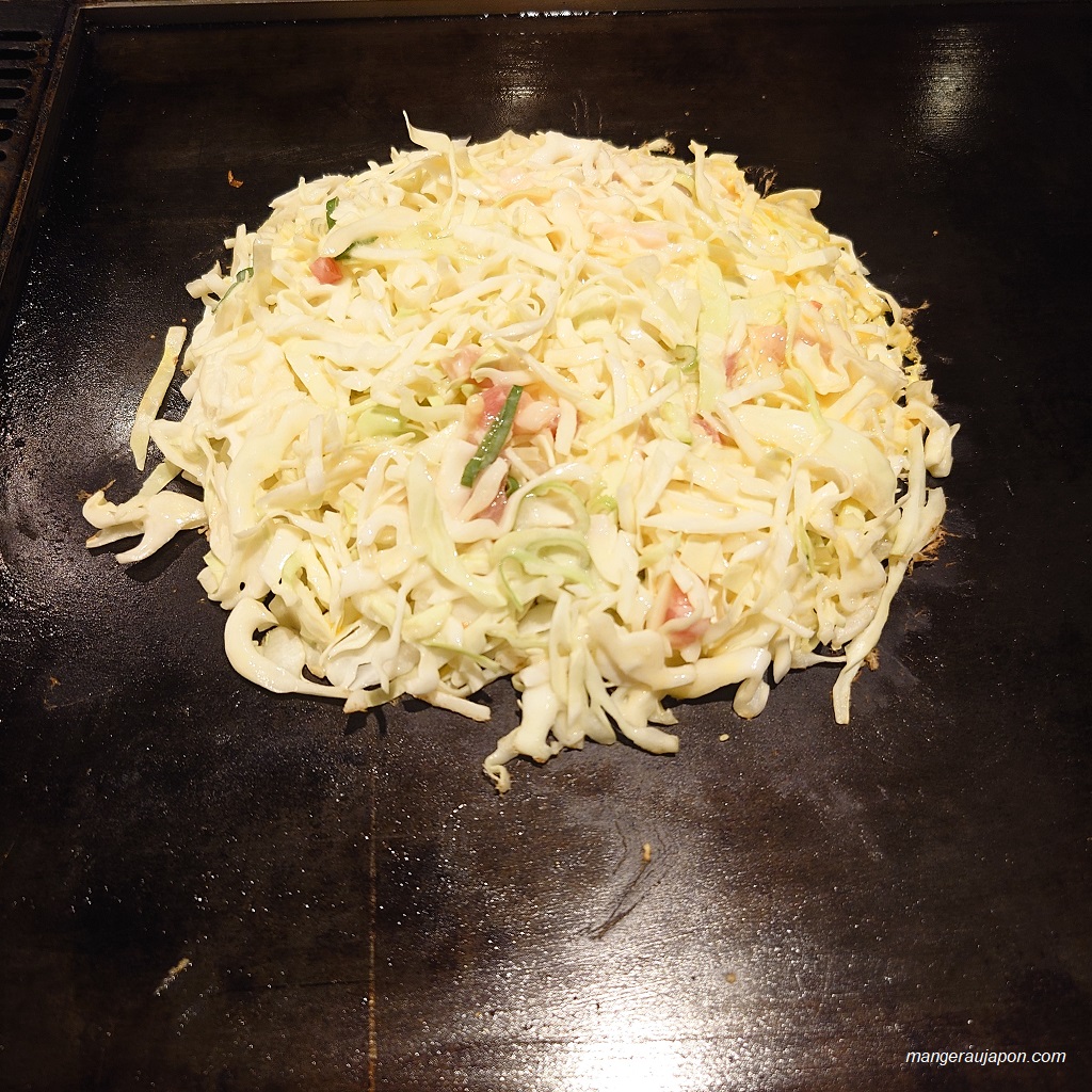 Il ressemble un peu à l’okonomiyaki dans la forme ou la présentation, mais il ne contient pas de pâte à base de farine, contrairement à l’okonomiyaki.