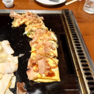 L’okonomiyaki est la vedette du menu. Il s’agit d’une galette composée de pâte à base de farine, d’œufs, de chou et de divers ingrédients au choix comme :